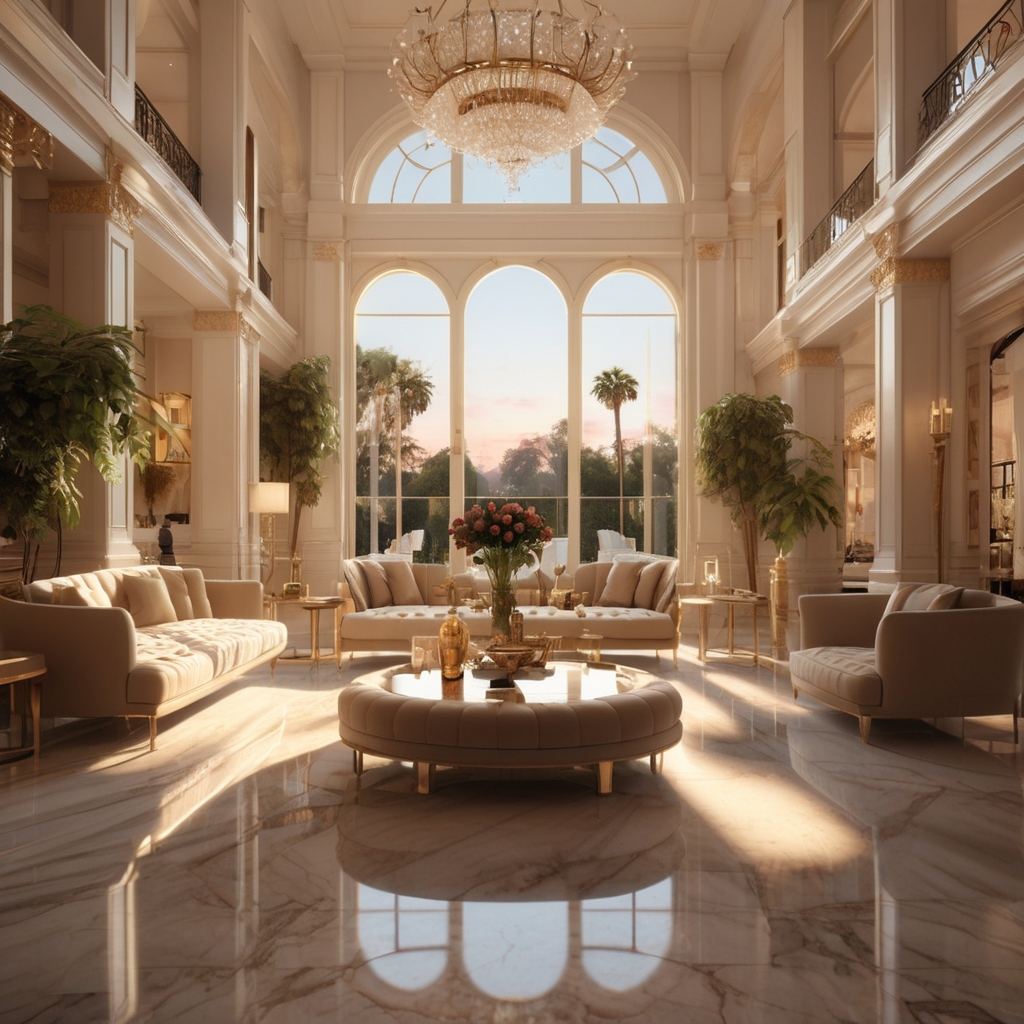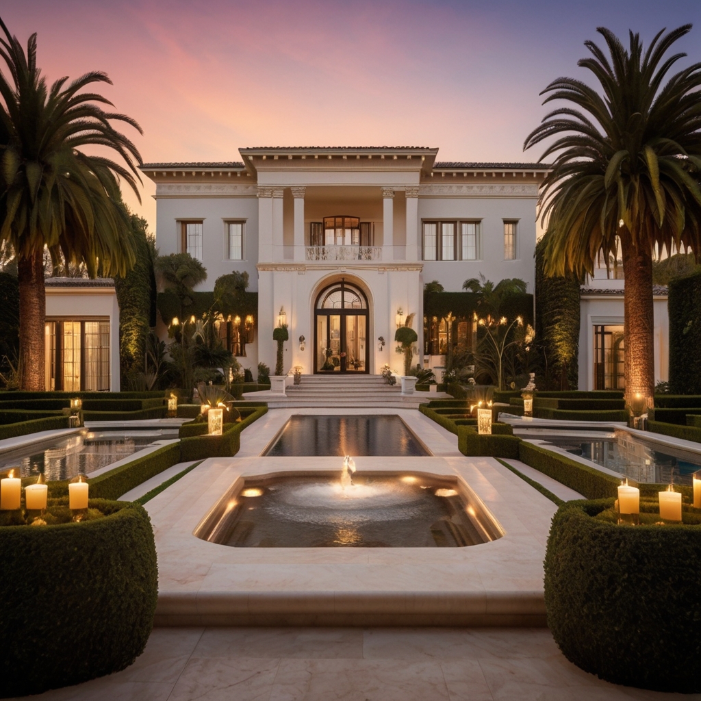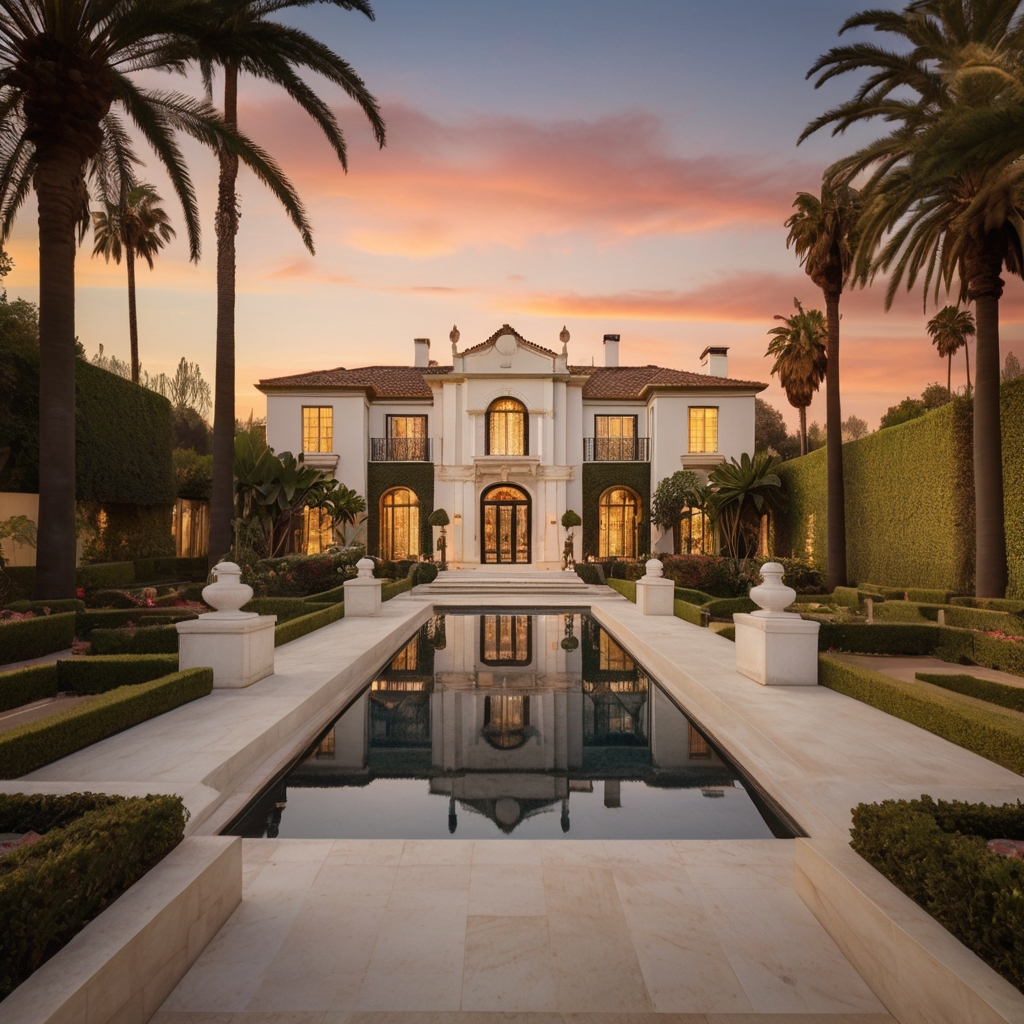 Perched atop the prestigious hills of Beverly Hills, this ultra-luxury mansion is a masterpiece of Hollywood Regency grandeur, bathed in the golden glow of a California sunset.