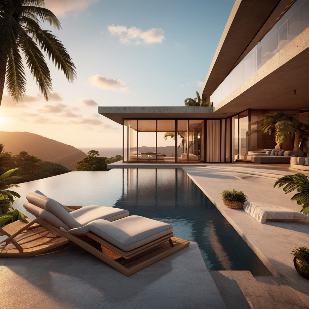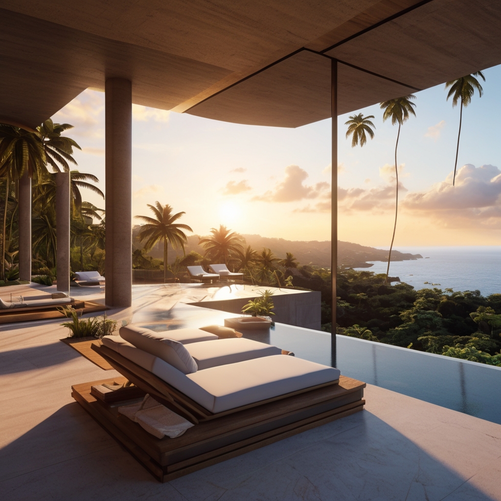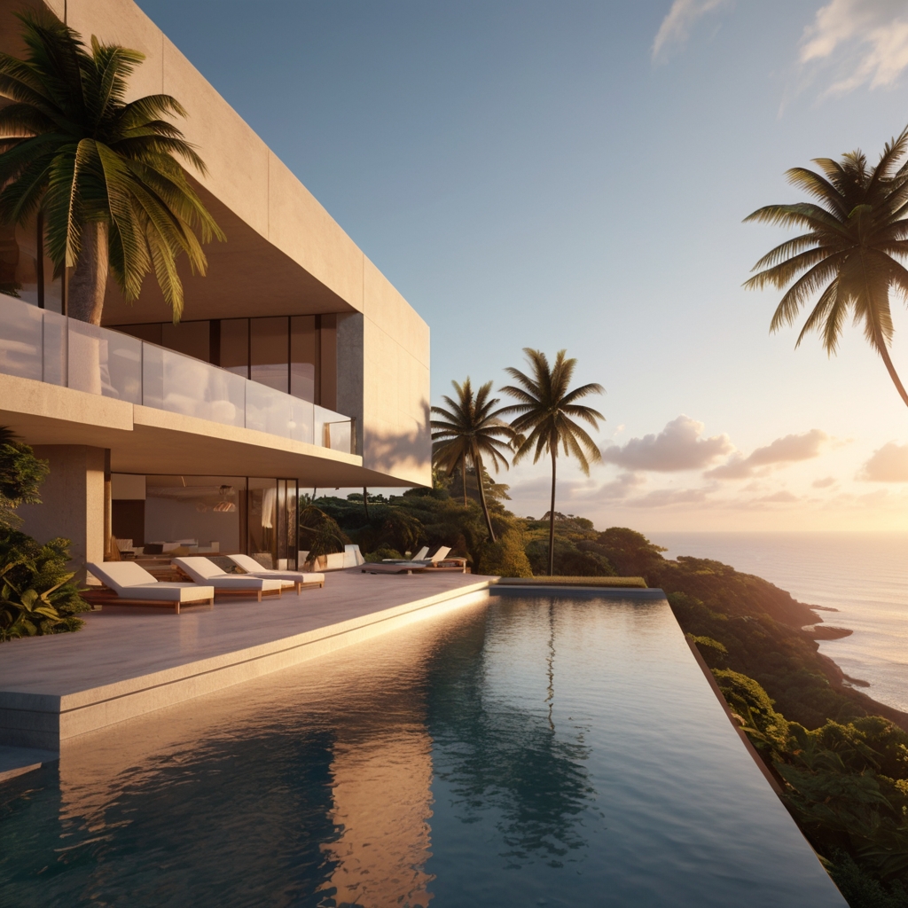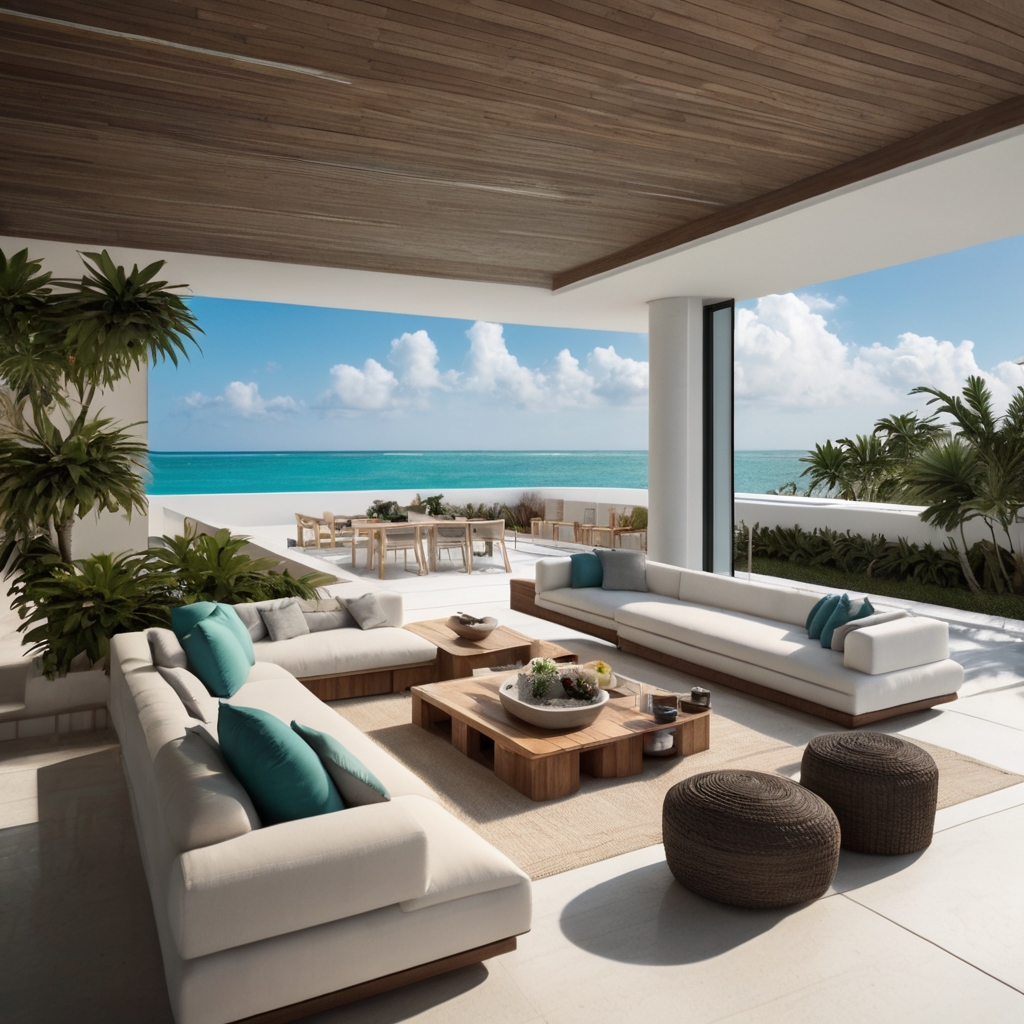 Towering floor-to-ceiling glass walls dissolve the boundaries between the sun-drenched interiors and the endless turquoise ocean, while clean lines, warm teak accents, and smooth concrete finishes create a harmonious blend of sophistication and relaxation.