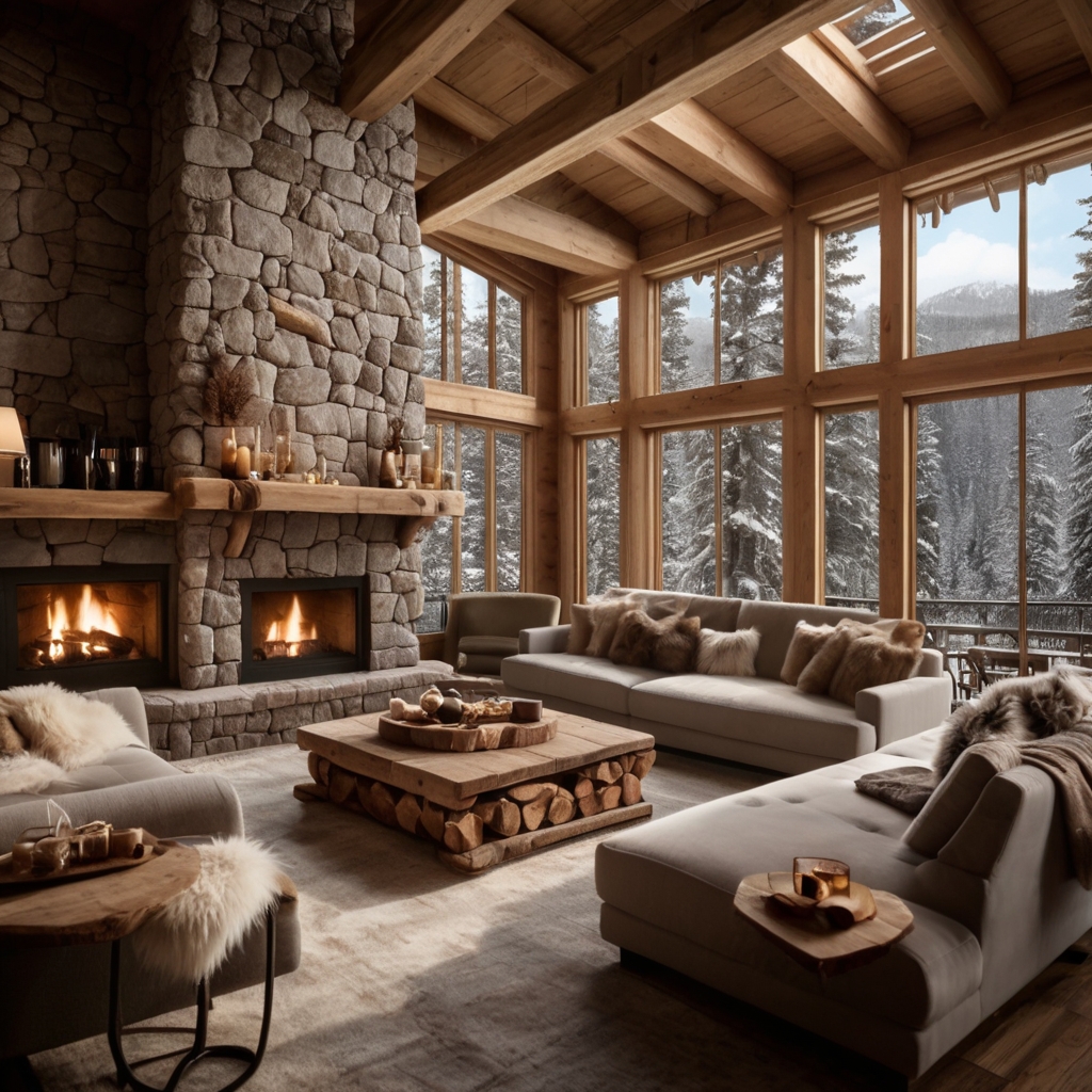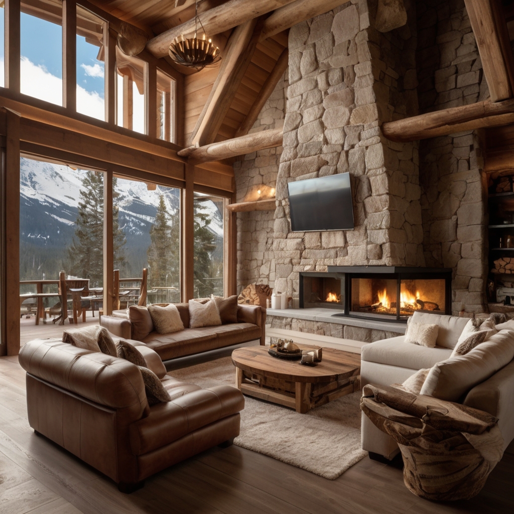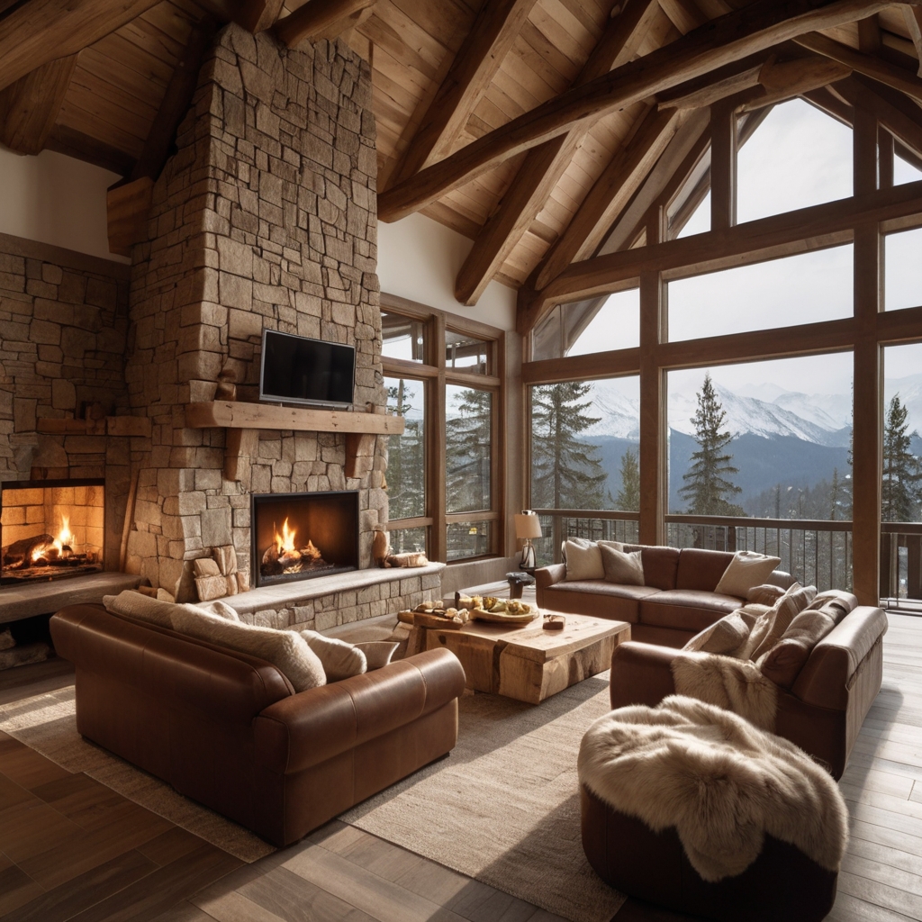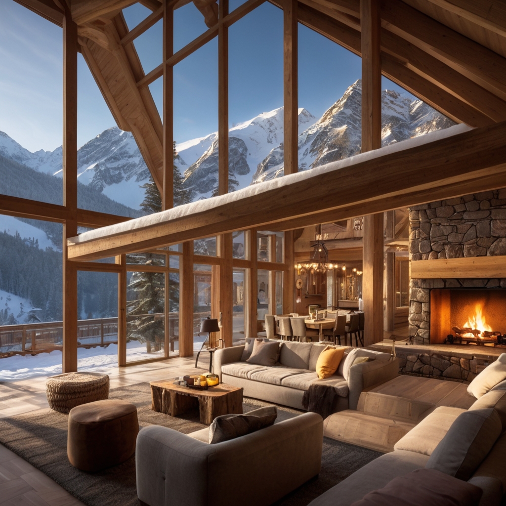 Floor-to-ceiling windows frame panoramic views of untouched wilderness, while a crackling stone fireplace warms the soul after a day on the slopes.