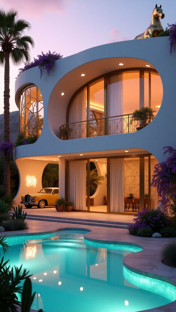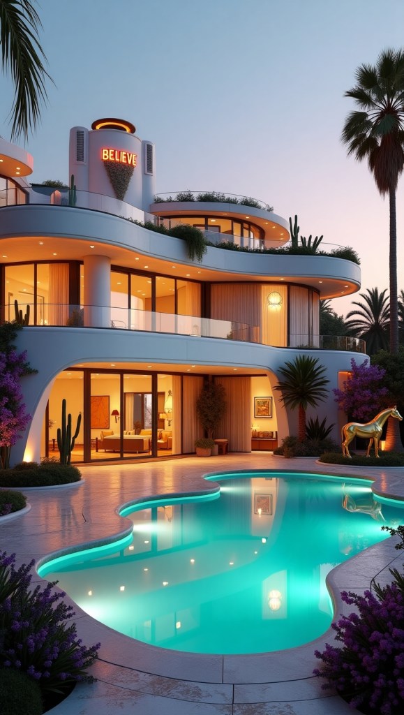 A vintage Rolls-Royce parked in the driveway and a glowing neon “BELIEVE” sign add playful, personal charm, suggesting a resident who thrives on bold self-expression. Above, a rooftop garden bursts with neon-lit sculptures and cascading greenery, juxtaposing nature with futuristic flair.