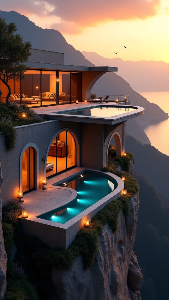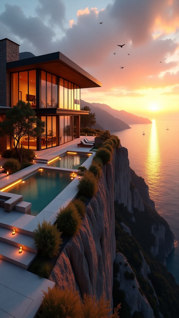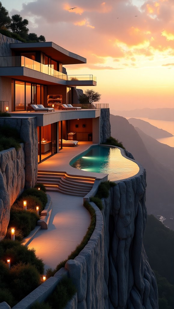 Perched on a dramatic cliffside, this breathtaking luxury dream home boasts grand panoramic views of a sun-drenched valley below, bathed in the warm, golden-hour glow.