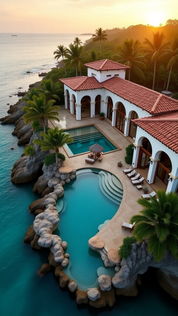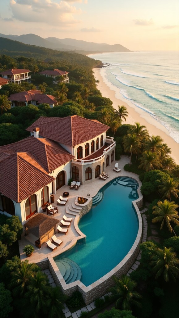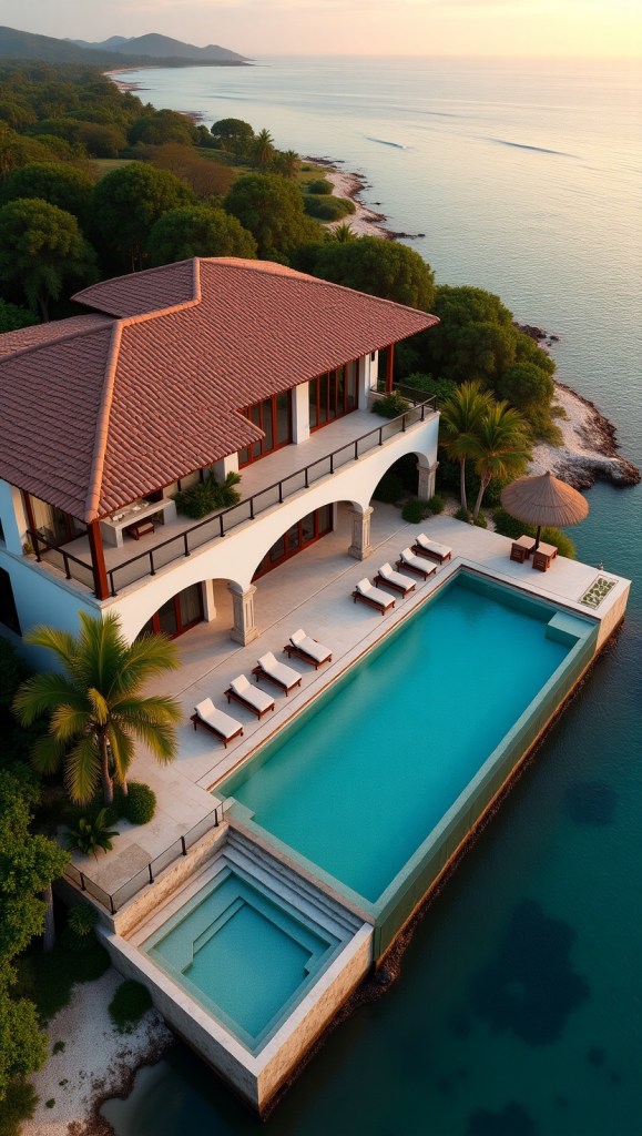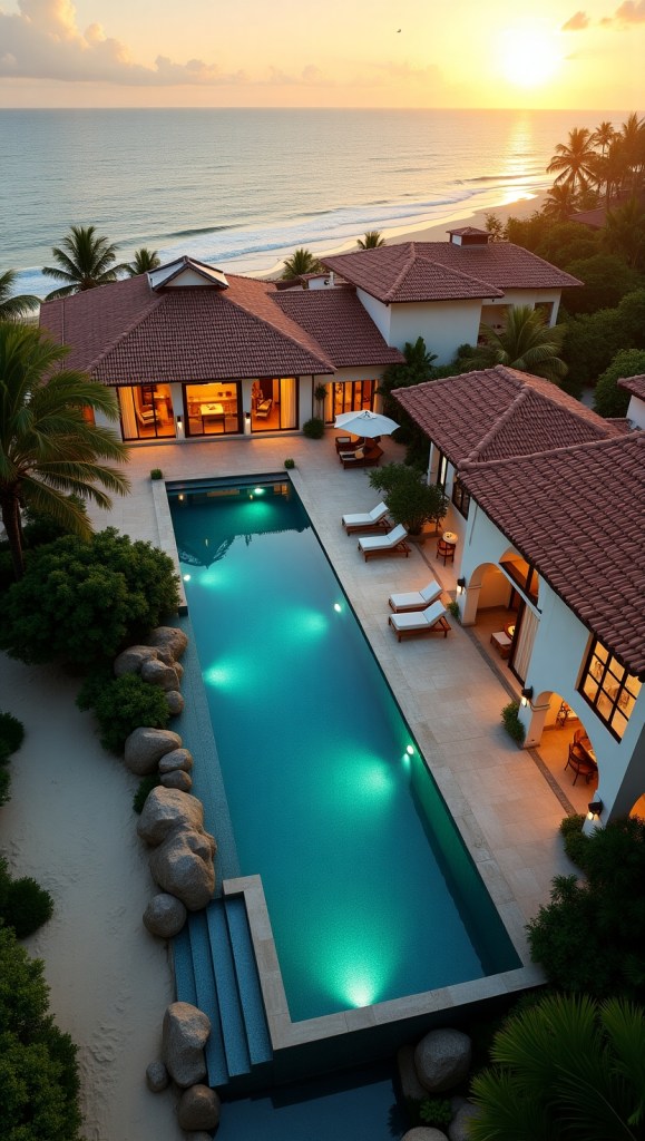 At the heart of the estate lies its crowning jewel: a 40-meter tiered infinity pool that appears to cascade into the ocean itself. Mosaic tiles in shades of aquamarine and seafoam mimic the rhythm of waves, while sunken lounge beds and in-water chaise longues offer immersive relaxation. By day, the solar-heated waters shimmer under the tropical sun; by night, submerged LED lighting creates an ethereal glow.