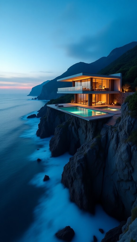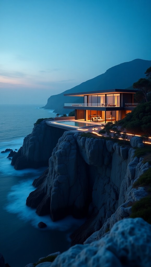 Perched on the edge of a rugged ocean cliff, this breathtaking mansion redefines luxury living. Captured during the elusive blue hour—the magical time between sunset and darkness—these images showcase a home where cutting-edge design harmonizes with untamed nature. Every angle, illuminated by the soft glow of twilight, tells a story of exclusivity, serenity, and architectural brilliance.